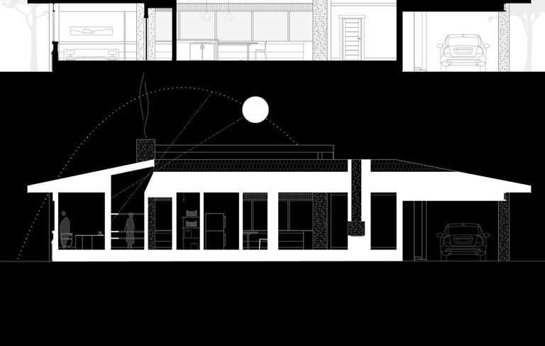 This sleek mid-century modern, single floor two bed two bath is our most recent design exercise. Its compact 1200 s.f. design emphasizes plan efficiency and views to nature.